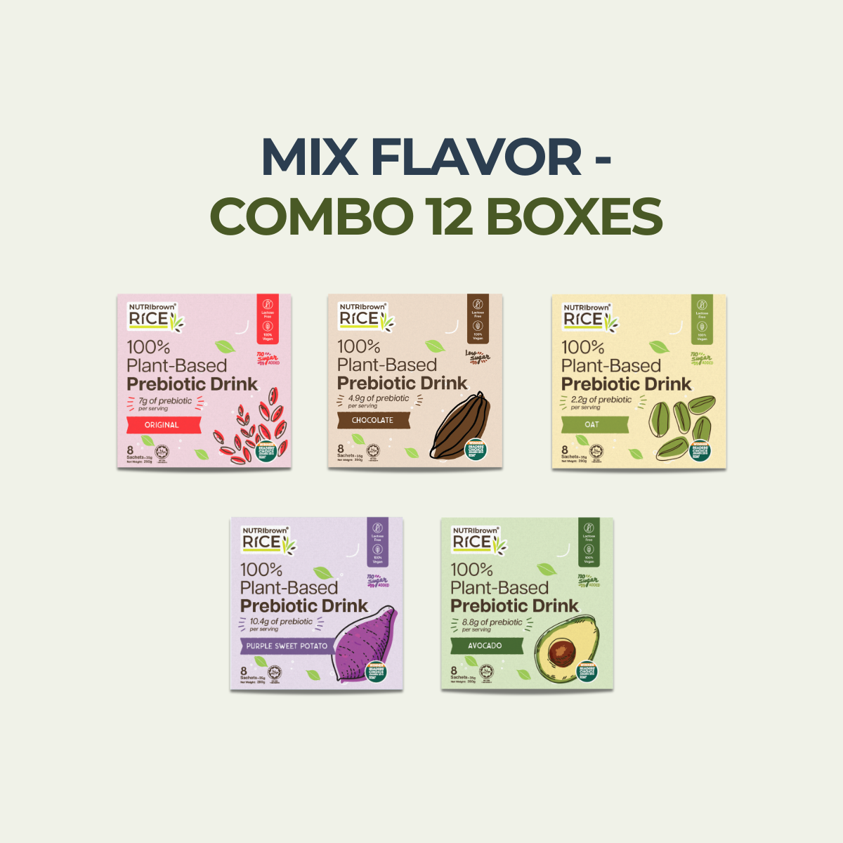 • 12 boxes of Nutribrownrice with flavor options: Original, Oat, Chocolate, Purple Sweet Potato, and Avocado.